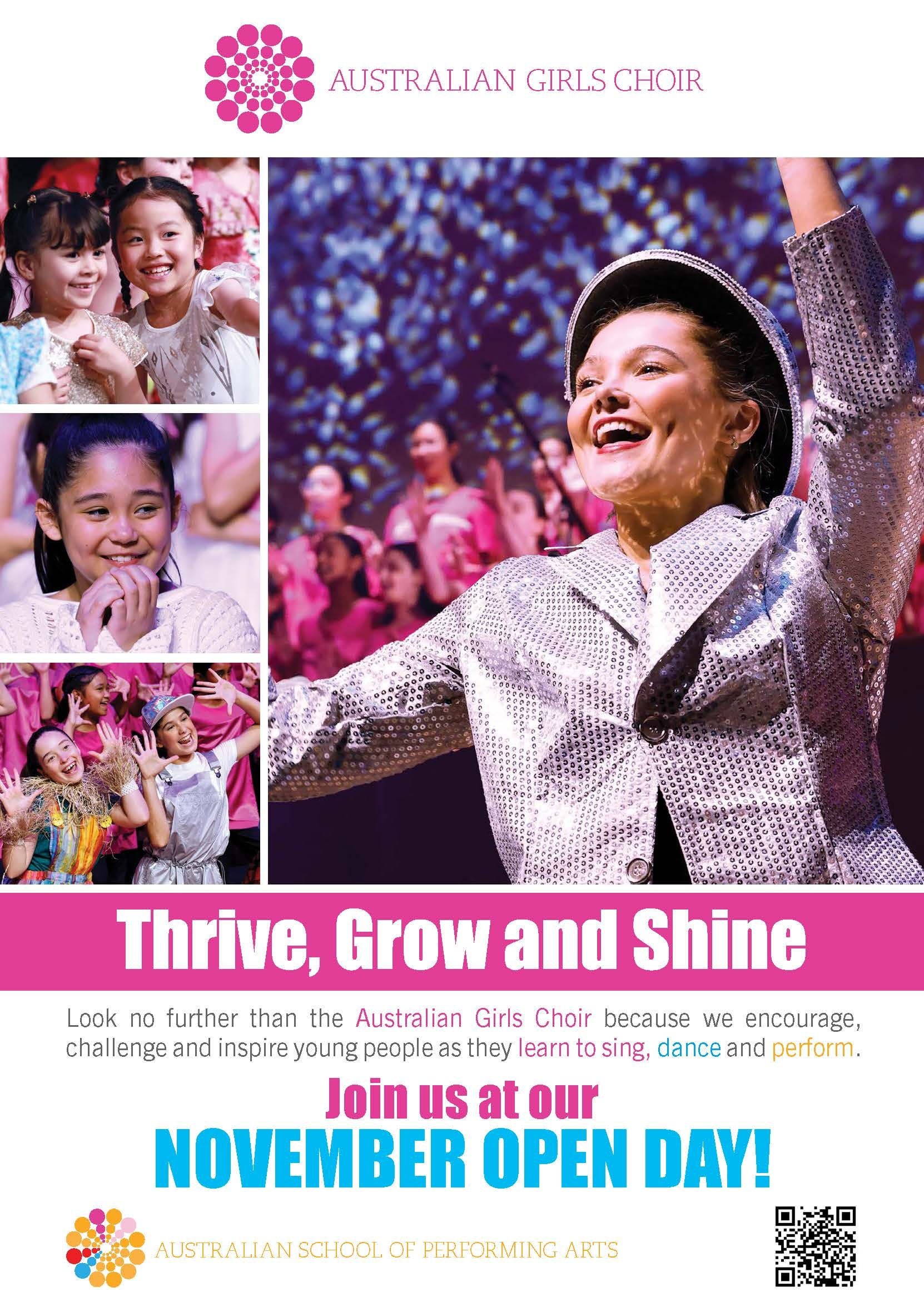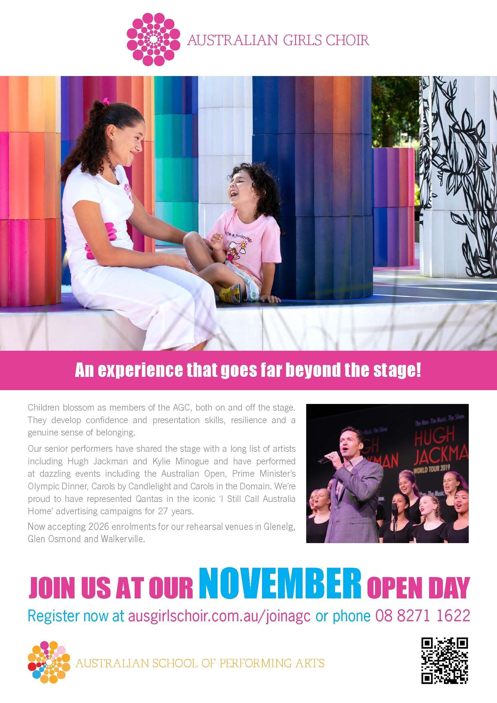 Look no further than the Australian Girls Choir (AGC) because we encourage, challenge and inspire girls as they learn to sing, dance and perform. You’re invited to come along to our November Open Day to try our fun and inclusive classes and learn more about being part of the AGC! To confirm your booking, visit ausgirlschoir.com.au/joinagc