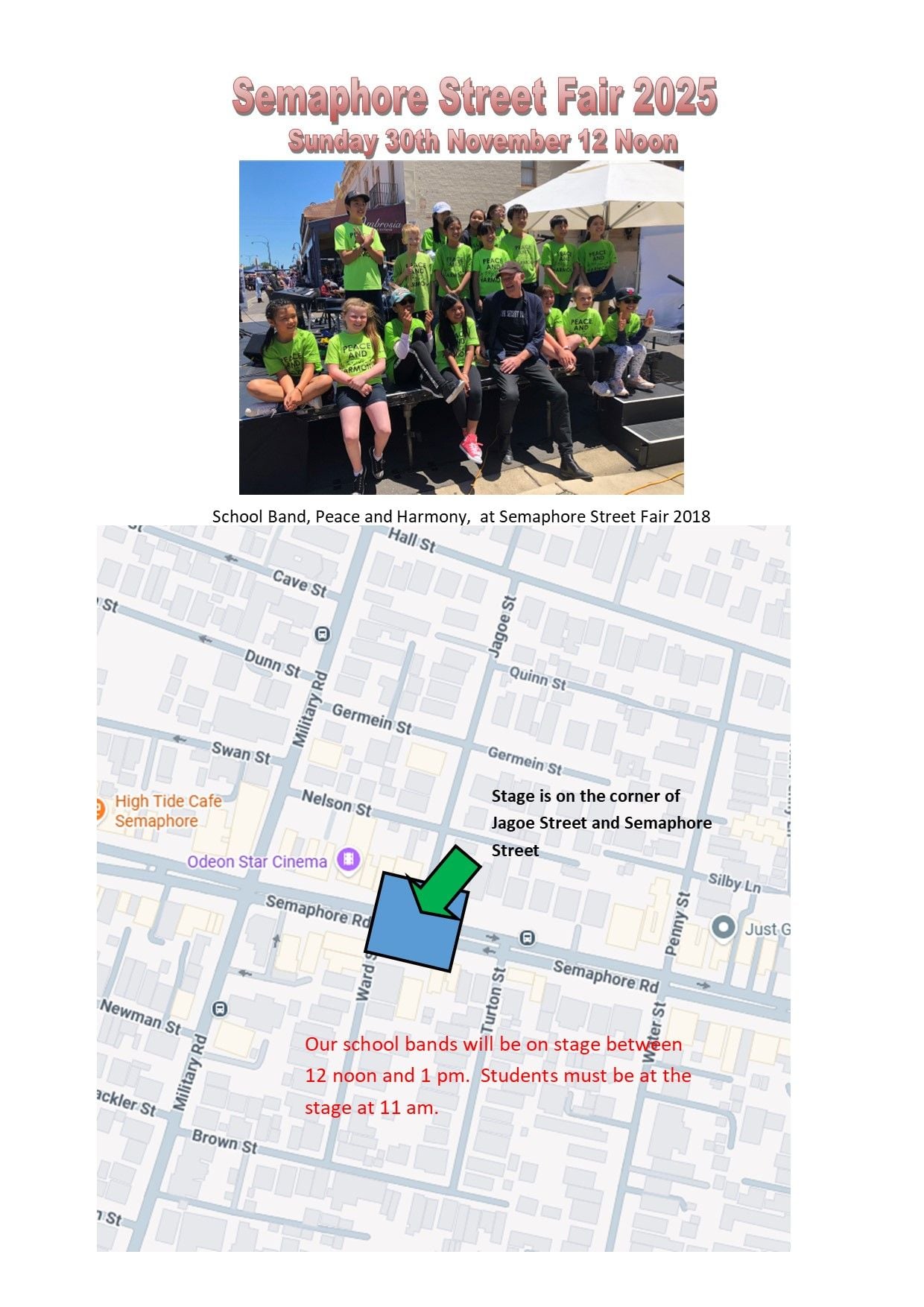 Our school bandwill perform at the Semaphore Street Fair on Sunday 30 November at 12:00pm on the Jagoe Street stage. It would be great to see members of our school community come along on the day to support the band.