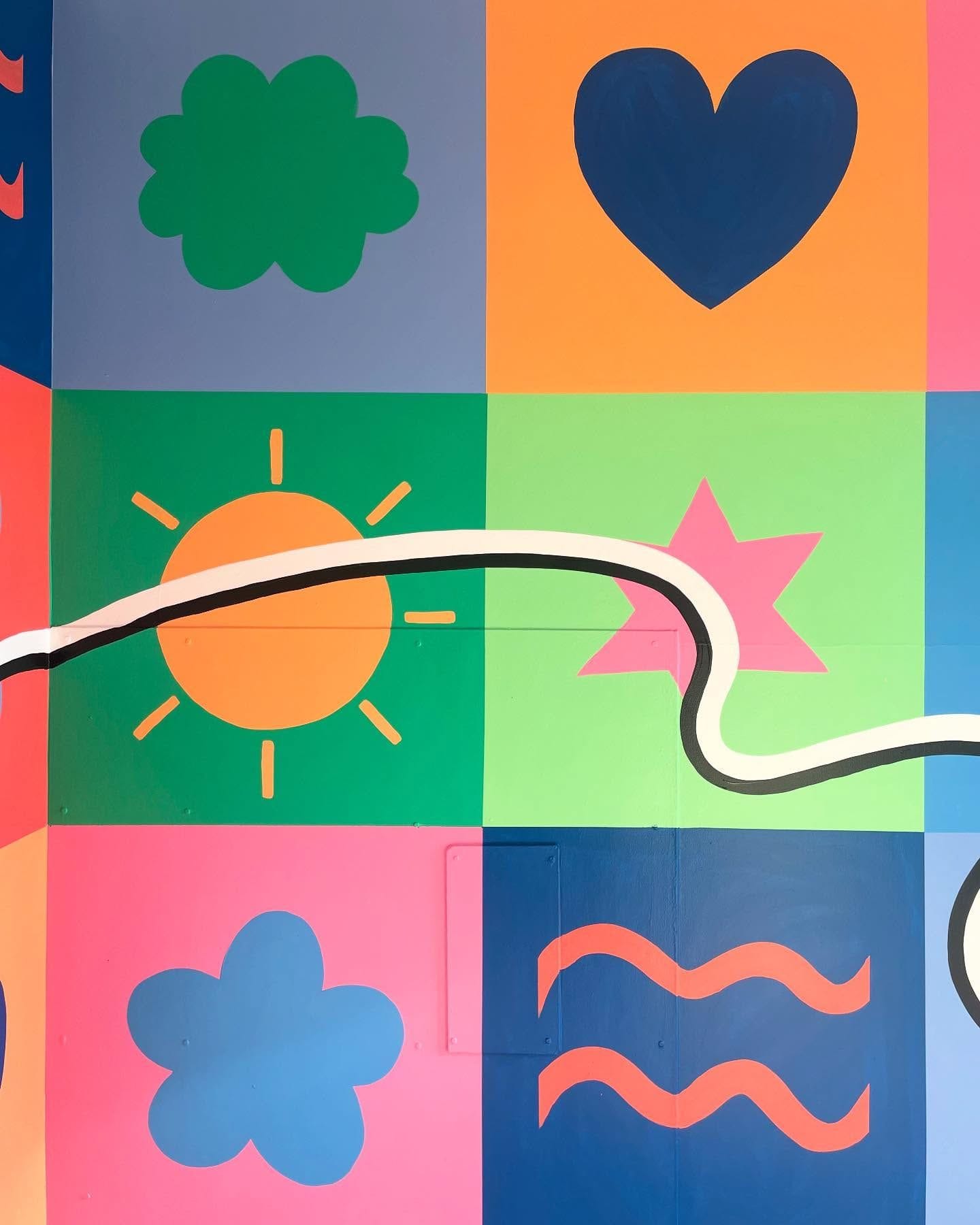 Big block shapes, every single one drawn from student illustrations. A bright, bold message to carry through the day: It’s cool to be kind. This mural wraps around the walls of the junior primary bathroom- adding colour, joy, and a daily nudge toward kindness in one of the most frequented spaces at school. It’s a playful and powerful way to celebrate student voice and create a feel-good environment from the ground up." - Gen