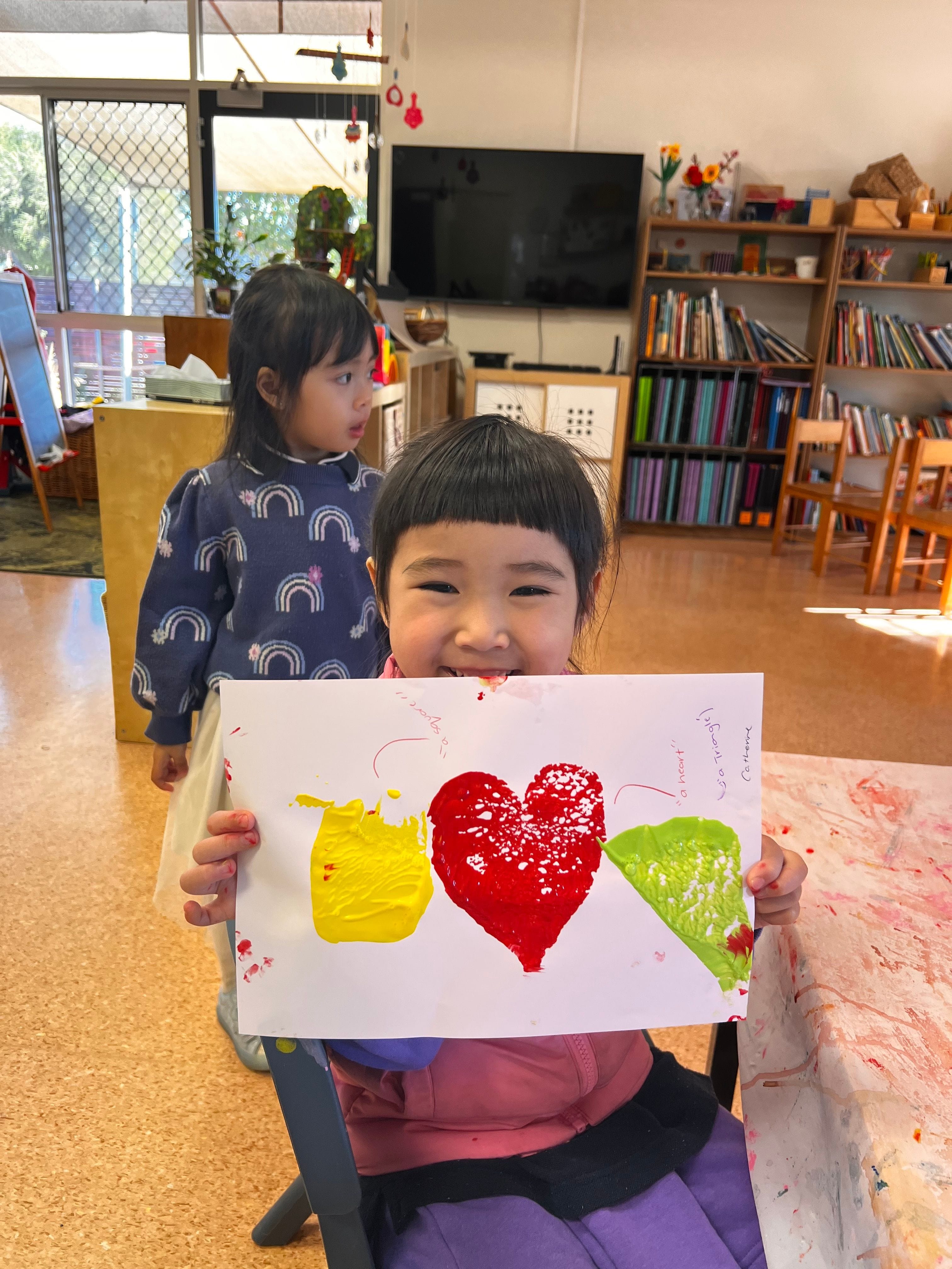 Preschoolers have also been exploring shapes through painting and drawing, using stamps and blocks to create circles, squares, and other forms in their artwork.